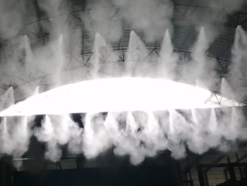 堆棚內(nèi)采用高壓微霧抑塵系統(tǒng),每個棚子根據(jù)現(xiàn)場實際情況進行分區(qū)域獨立控制,堆棚頂部分區(qū)域、網(wǎng)格化布置微霧噴頭,要求能滿足堆棚整體抑塵。霧化顆粒范圍:10-50μm,微霧顆粒與無組織粉塵/揚塵充分混合并形成含塵液滴,在自重的作用下沉降到地面,治理現(xiàn)場揚塵。大門設(shè)計獨立的噴霧裝置,要求能夠獨立控制;當運輸車輛進出入通過大門時, 紅外線感應(yīng)器將信號傳輸給設(shè)備PLC來控制干霧抑塵系統(tǒng)工作,給大門進行噴霧抑塵,并且噴霧時間可以調(diào)節(jié)。實現(xiàn)無人操作自動抑塵,有效的防止車間內(nèi)灰塵通過大門外溢的現(xiàn)象。主機采用變頻自動恒壓供水,主機工作壓力恒定為6-7MPA。(壓力值大小可調(diào)節(jié)),可在主機面板上直觀地觀察到進水壓力和高壓出水工作壓力。